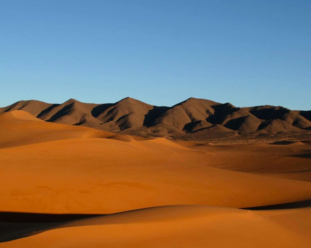 De Sedra nous partons par un plateau vers les grandes dunes, porte d’entrée des dunes de Cheggaga. Déjeuner au milieu de nulle part. Puis l’après-midi nous marchons au milieu de dunes majestueuses. Nous sommes au cœur du désert de sable de Daya Hamra, zone de drainage entre les massifs de dunes. Cette zone en hiver, après les pluies, se couvre de verdure et de fleurs.
