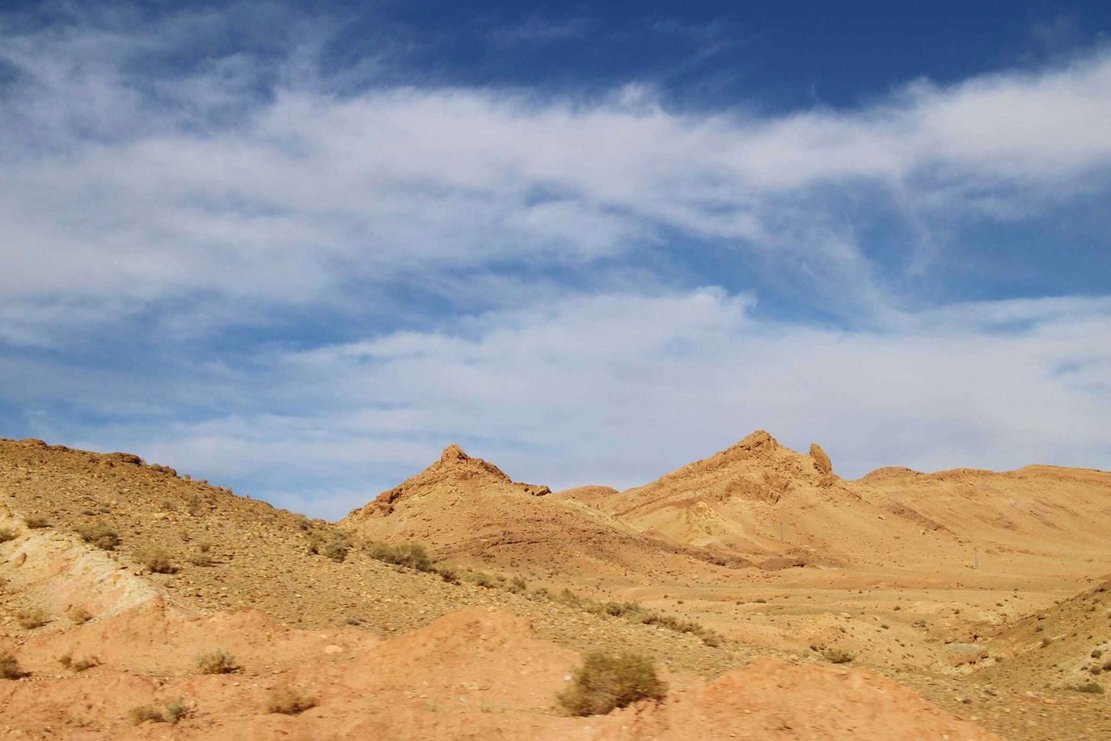 Une journée de route mais que nous abordons comme une belle découverte. De la plaine du Haouz nous grimpons vers Le tizi n’Tichka, col à plus de 2200 m d’altitude. Il donne accès au versant sud de l’Atlas et le bassin d’Ouarzazate. On sent de plus en plus le sud. Puis la route franchit à nouveau de superbes montagnes désertiques, le massif du Sagho partie ouest pour atteindre la superbe vallée du Drâa, ses villages bâtis en pisé, Agdz, Zagora, ses palmeraies, et c’est l’arrivée à M’Hamid au bout de la route goudronnée à la porte du « Grand Désert ». Nous y retrouvons notre équipe de chamelier. Une petite marche pour atteindre un bel endroit de bivouac. Installation au bivouac saharien: tente igloo et tente Mess.